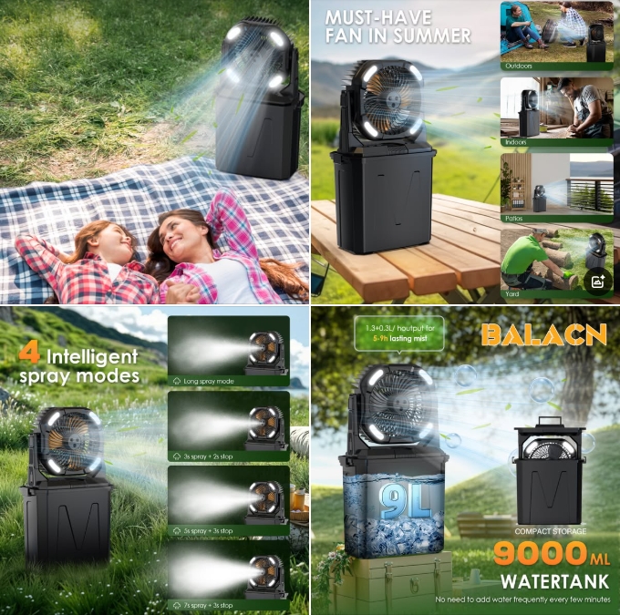 Among the standout products is the misting fan, which has gained popularity among camping and outdoor enthusiasts for its extra-large water tank and easy-to-store design. Despite the large water capacity, its thoughtful design makes it compact and portable—an essential companion for any outdoor adventure. The misting feature delivers rapid cooling, instantly refreshing users in the heat, while the powerful airflow effectively drives away humidity, creating a comfortable outdoor environment.