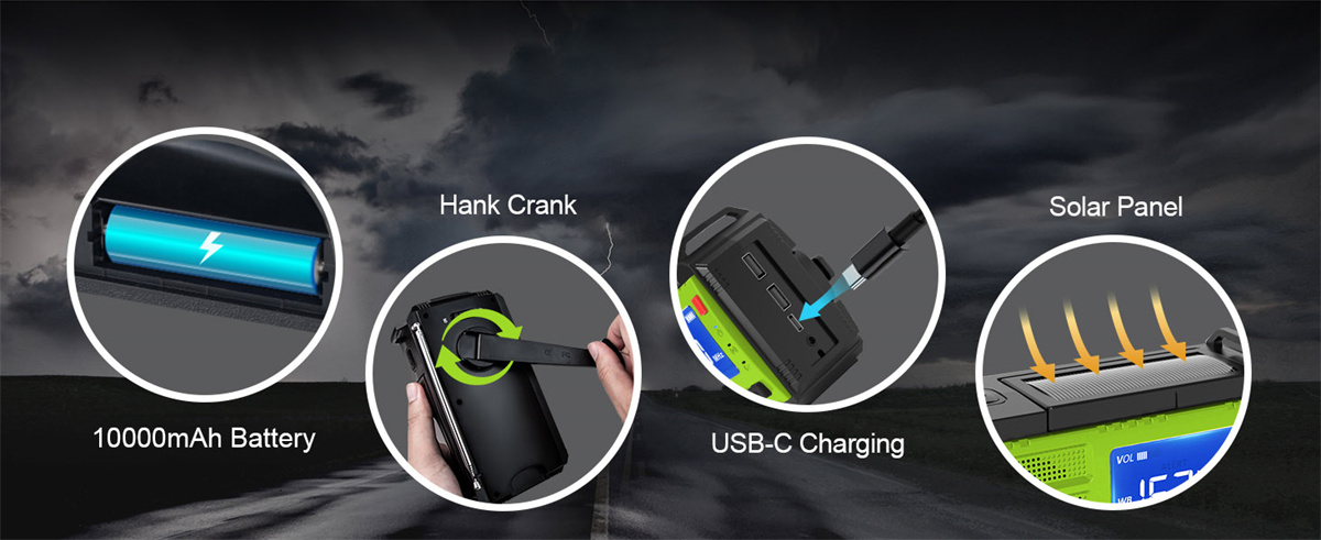 Stay powered with Type-C fast charging, hand crank, solar panel, or AAA batteries — reliable under any circumstances.